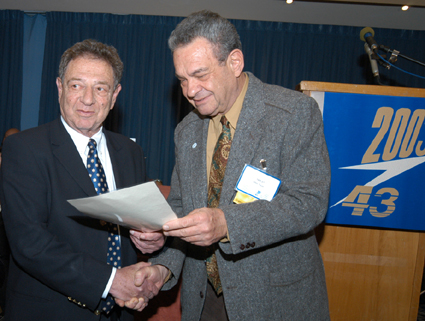 יו"ר וועד האגודה, דב סער (מימין) מעניק את תעודת חברות הכבוד למשה קרת.