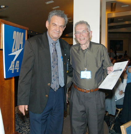 יו"ר ועד האגודה, דב סער (משמאל) מעניק את תעודת חברות הכבוד לד"ר זאב בונן.