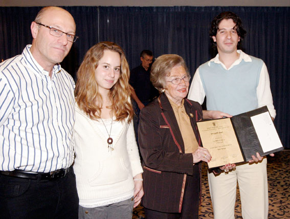 שולמית הלל, בנה ונכדתה מעניקים את הפרס לאביעד גופר (מימין).