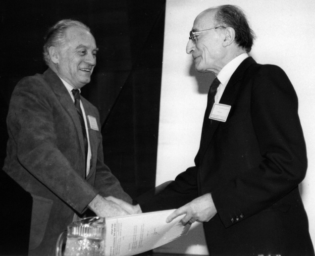 יו"ר ועד האגודה, דב סער (משמאל) מעניק תעודת חברות כבוד באגודה לפרופ' דוד אביר
