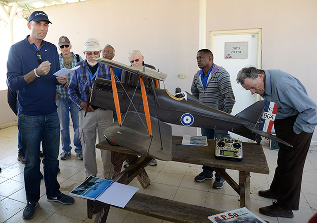 אורן אברמוב (משמאל) מציג את טיסנו המתכונתי SE.5a