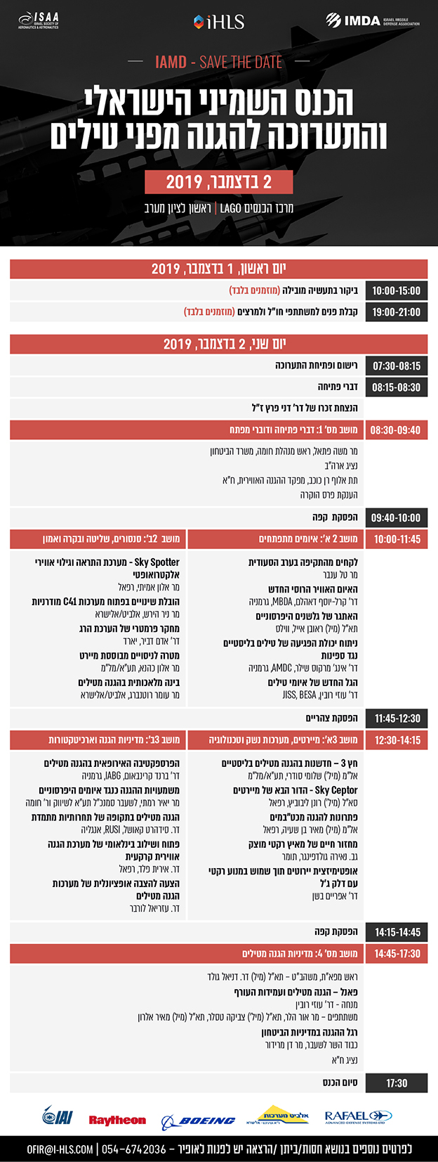 הכנס הישראלי השמיני להגנה מפני טילים ייערך ביום שני, 2 בדצמבר 2019, במרכז האירועים לאגו במערב ראשון-לציון.