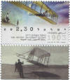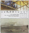 | הבול השלישי מתאר את רגע השיא – אורוויל רייט מטיס את הפלאייר ב-17 בדצמבר 2003, ובשובל נראה המטוס באוויר ונתוני הטיסה. | |