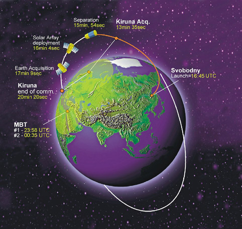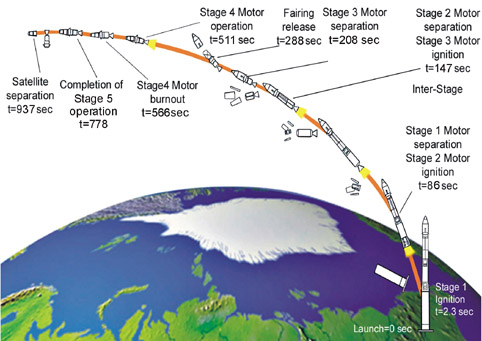 תרחיש השיגור, המתאר את שלבי הצבת הלוויין בחלל מרגע השיגור מסבובודני.