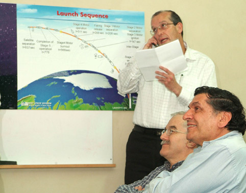 בחדר הבקרה של מפעל מבת-חלל בתע"א לאחר השיגור המוצלח (מימין לשמאל):