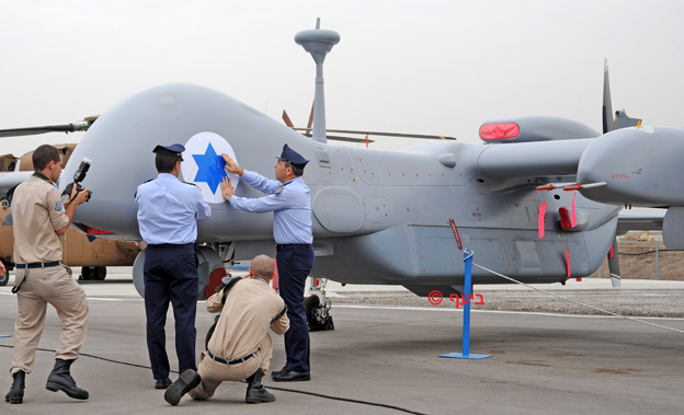 מפקד חיל האוויר, אלוף עידו נחושתן (מימין), מדביק את סמל החיל על מל"ט האיתן הראשון שנמסר ב-21 בפברואר 2010.