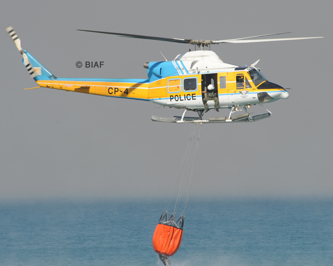 מסוק בל 412SP של משטרת קפריסין שואב מים מהים בתוך סל מיוחד.