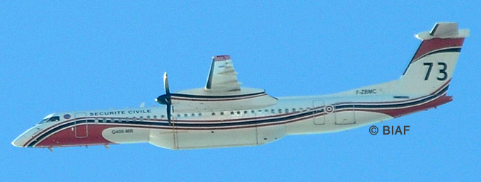 מטוס Q400-MR צרפתי. מטוס דש 8 זה הוסב לכיבוי שריפות על-ידי התקנת מכל גדול בגחון המסוגל להכיל כ-10,000 ליטר מים.