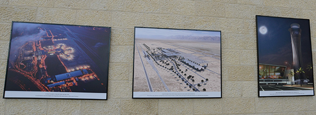 משמאל לימין: צילום אווירי של נתב"ג בלילה; נמל התעופה העתידי בתמנע ליד אילת; מגדל הפיקוח העתידי בנתב"ג.