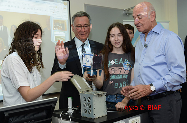 שתי תלמידות מדגימות לשר המדע, יעקב פרי (מימין), ולראש עיריית הרצליה, משה פדלון (במרכז), את הזנקת הלוויין